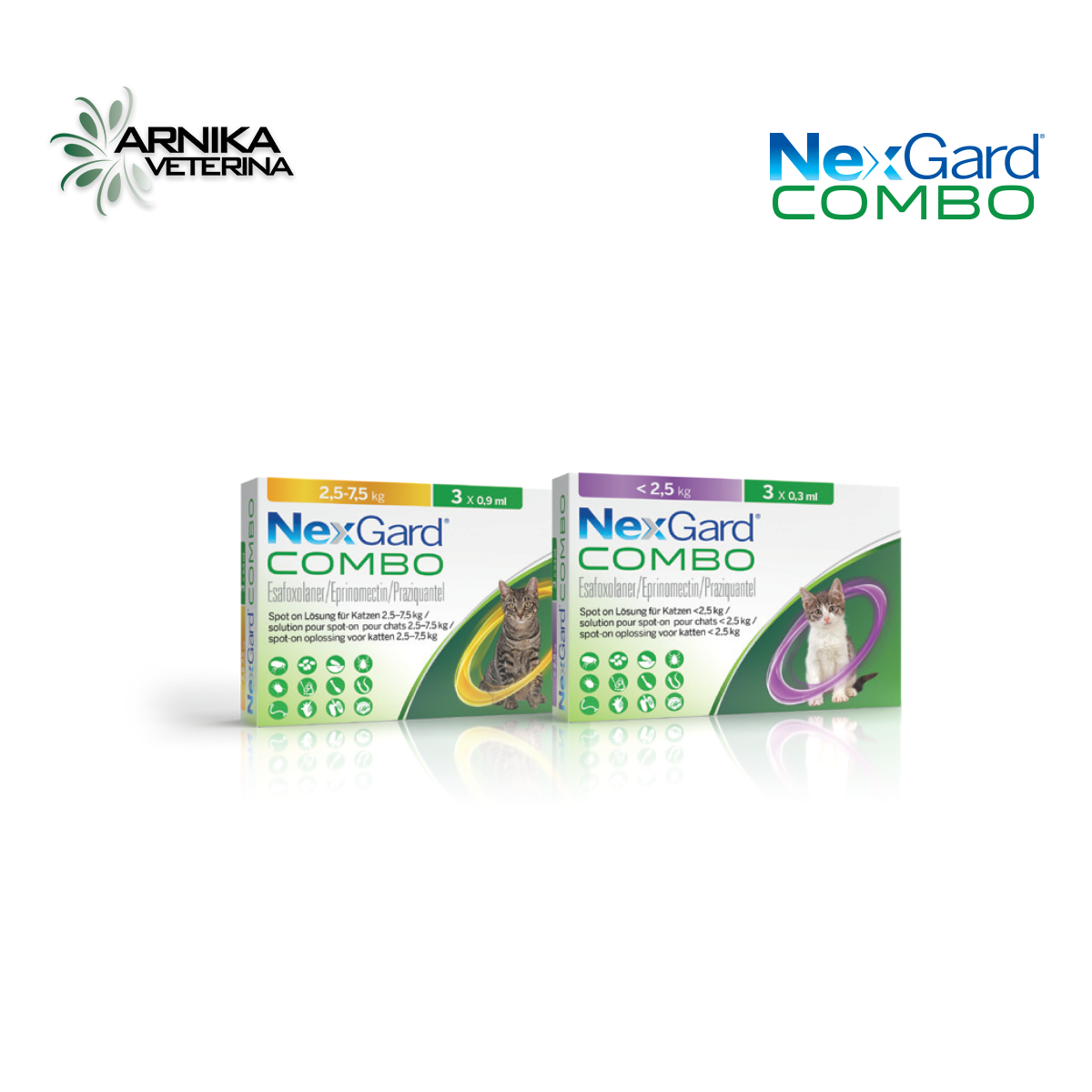 NexGard Combo spot-on otopina za mačke < 2,5 kg i mačke 2,5-7,5 kg. Aktivna tvar: mačke 0,8-<2,5 kg (volumen jedinične doze 0,3 ml): esafoksolaner 3,60 mg, eprinomektin 1,20 mg, prazikvantel 24,9 mg. Mačke 2,5–<7,5 kg (volumen jedinične doze 0,9 ml) : esafoksolaner 10,80 mg, eprinomektin 3,60 mg, prazikvantel 74,70 mg. Indikacije: Za mačke sa ili u riziku od miješanih infekcija cestodama, nematodama i ektoparazitima.